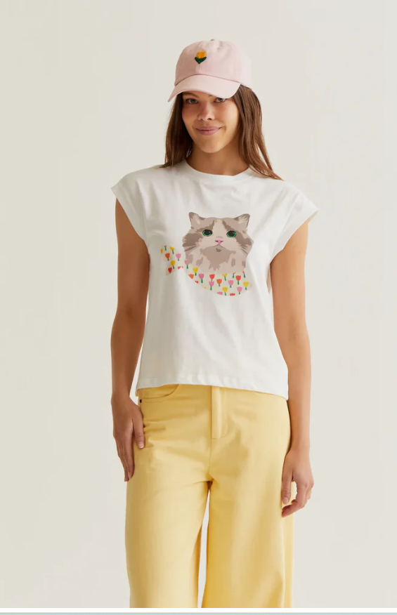 Camiseta de tejido 100% algodón con estampado de gatito. Cuello redondo y manga corta. La modelo mide 177 cm y lleva la talla S.