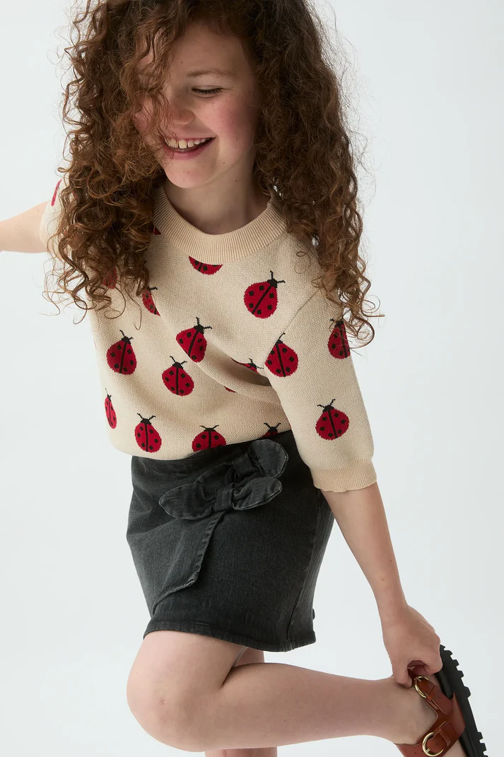Falda corta de niña con tejido denim de color negro. Cintura fija elástica de tiro alto. Detalle de lazos. Corte tipo pareo. La modelo mide 127 cm y lleva la talla 8-9 años.