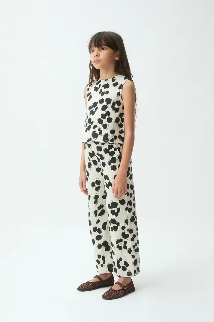 Pantalón de niña con tejido 100% algodón con estampado dalmatian. Cintura elástica de tiró alto. Pernera recta amplia. La modelo mide 133 cm y lleva la talla 8-9 años.
