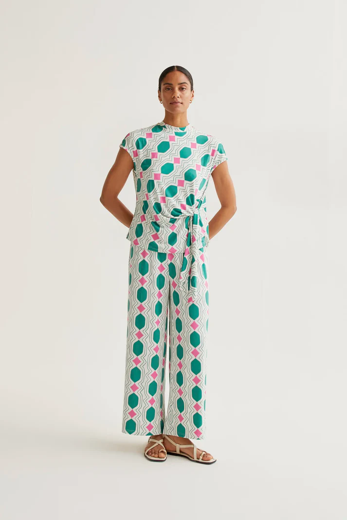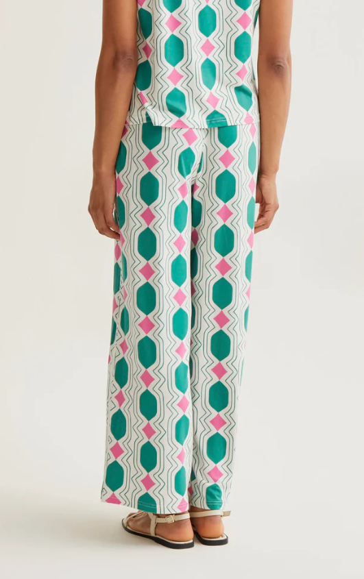 Pantalón de tejido jersey con estampado geometric. Cintura elástica de tiro alto. Pernera recta amplia. La modelo mide 173 cm y lleva la talla S.