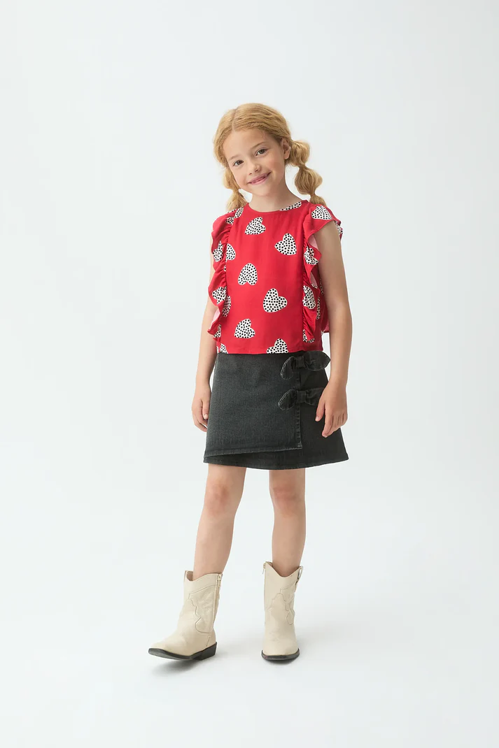 Top de niña de tejido crepé con estampado coccinella. Cuello redondo y manga corta amplia. La modelo mide 135 cm y lleva la talla 8-9 años.