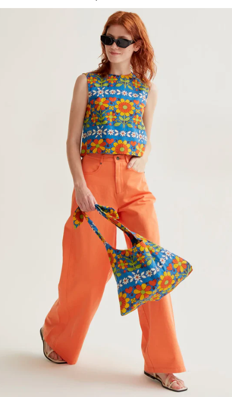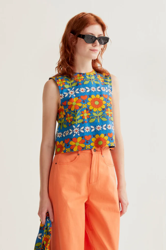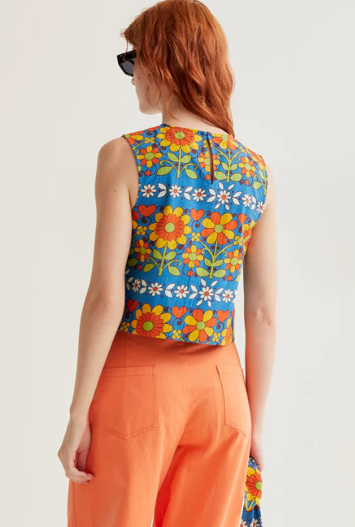Top de tejido 100% algodón con estampado garden. Cuello redondo y sin mangas. Cierre posterior con botón oculto. La modelo mide 175 cm y lleva la talla S.
