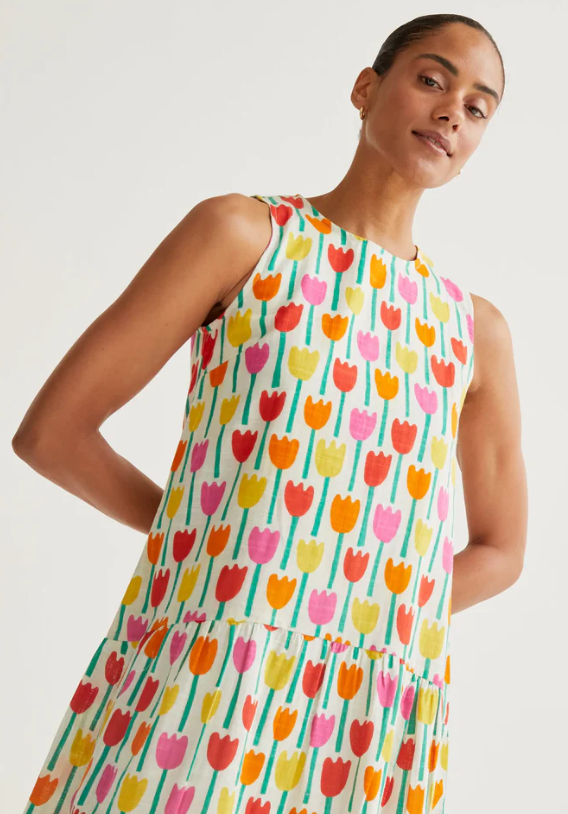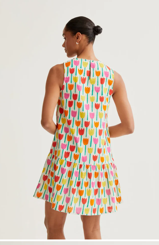 Vestido corto de tejido 100% algodón con estampado tulipa. Cuello redondo y sin mangas. Cierre posterior con botón oculto. Detalle en falda. Corte fluído.Forro interior.La modelo mide 173 cm y lleva la talla S