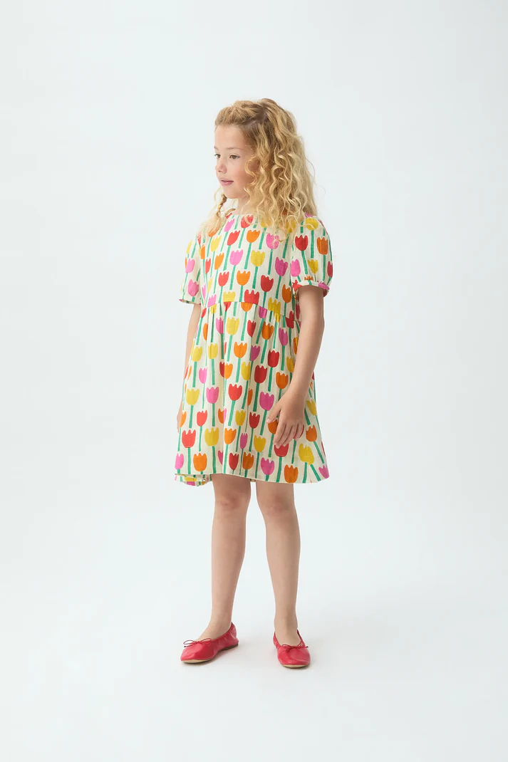 Vestido corto de niña con tejido 100% algodón con estampado tulipa. Cuello redondo y manga corta abullonada.Falda amplia. La modelo mide 126 cm y lleva la talla 8-9 años.